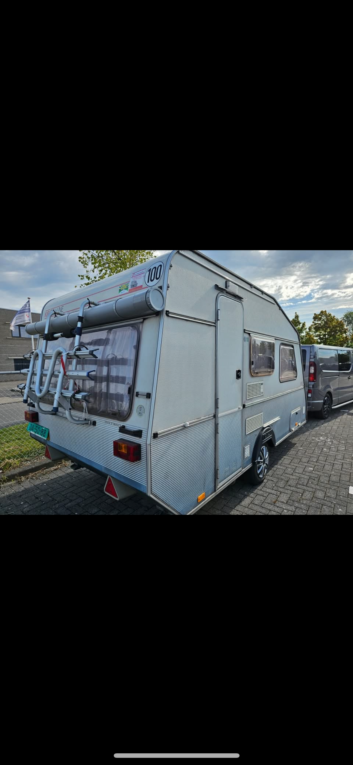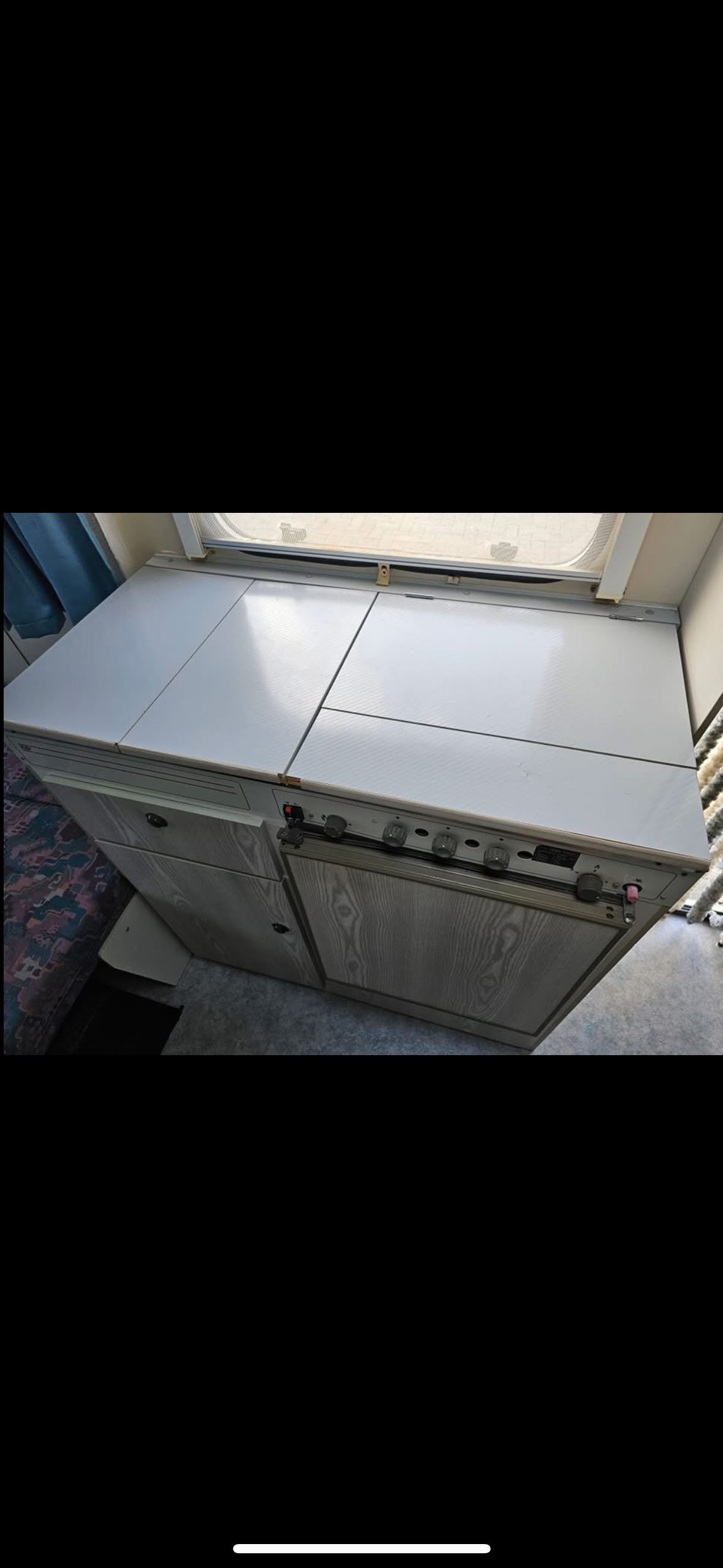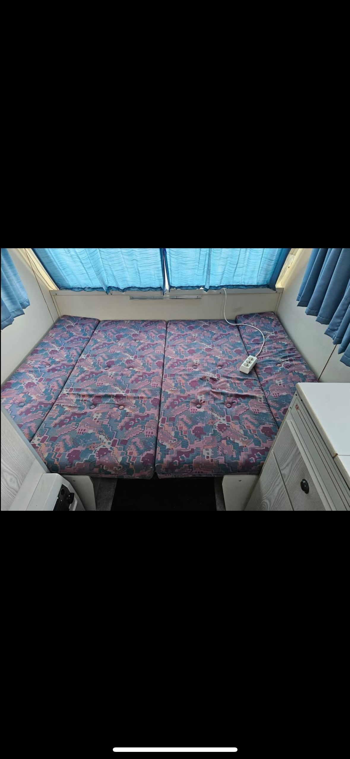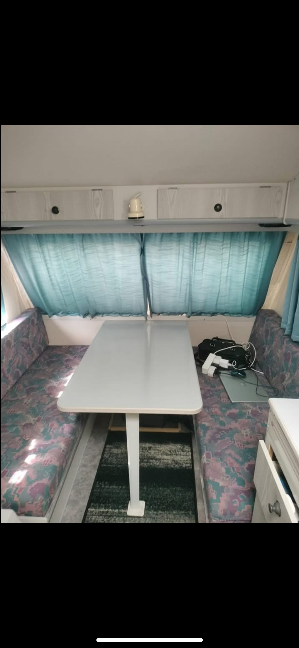 caravan heeft een stapelbed,middenkeuken,toiletruimte met casettetoilet en treinzit om te vormen tot 2p, bed